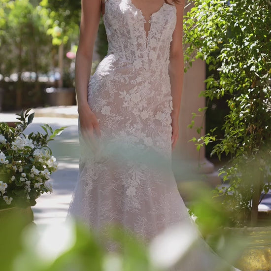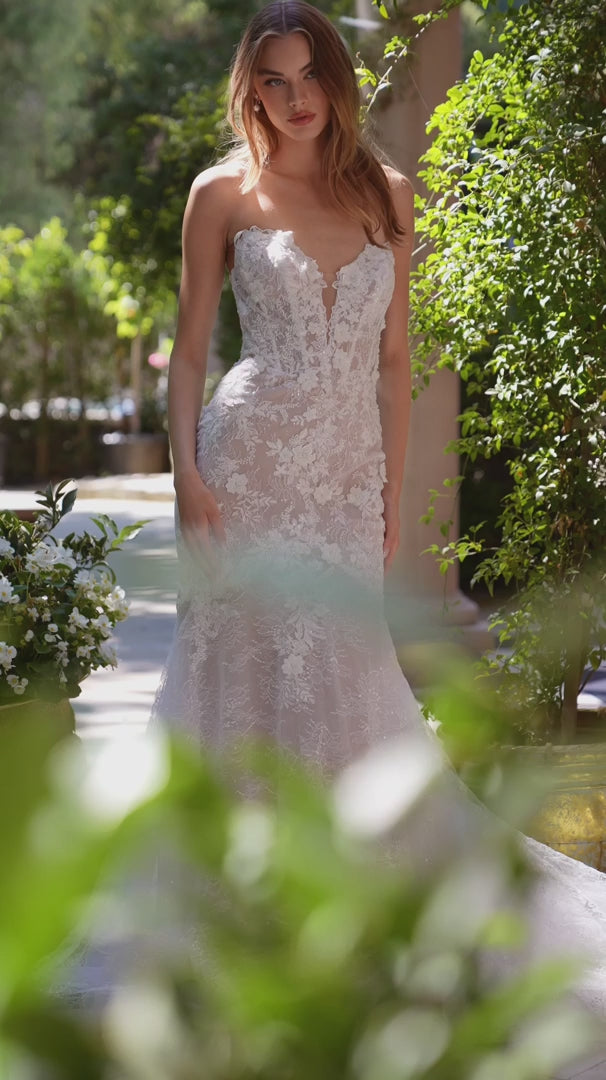 Este vestido de novia sin tirantes ofrece una visión refinada del romance con su silueta que realza las curvas y su detalle de encaje floral. El escote corazón pronunciado se suaviza con apliques florales que ascienden por el corsé transparente, mientras que la falda sirena se desliza en una elegante cola. Con un sutil forro nude que aporta profundidad y contraste, este vestido presenta una dimensión moderna a un look nupcial clásico. Ideal para bodas en destino.
